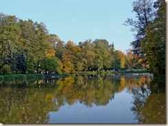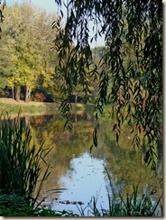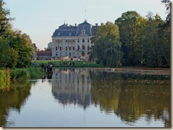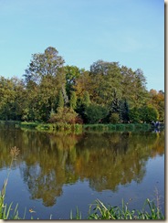 Stojąc na przeciwległym brzegu stawu, obserwowałam odbicie zamku w spokojnym lustrze wody. Ta okazała budowla widoczna jest prawie z każdego zakątka parku. Nieraz widzimy ją w naturalnej ramie zieleni.