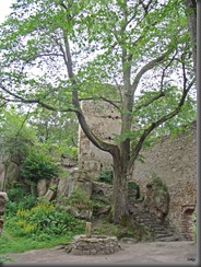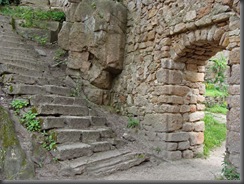 Po prawej stronie dostrzegam kamienne schodki prowadzące prawdopodobnie do basteji (budowla fortyfikacyjna, będąca murowanym lub ziemnym umocnieniem w formie niskiej, przysadzistej baszty obronnej).