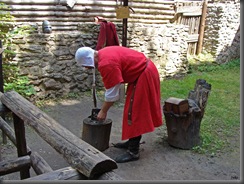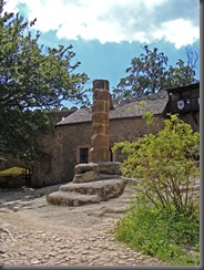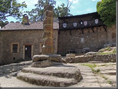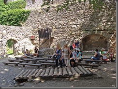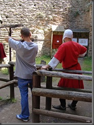 Płynąca z głośników opowieść przyciąga uwagę zwłaszcza dzieci, które cichną i przysłuchują się z ciekawością. Centralne miejsce na dziedzińcu zajmuje kamienny pręgierz z XV w. do którego można było przykuć jednocześnie cztery osoby. Wiele przechodzących obok niego lub też przysiadających pod nim osób, zwłaszcza młodych ludzi, nie zdaje sobie do końca chyba sprawy, ileż wydarzyło się tutaj ludzkich tragedii. Wzdłuż kurtyn zbudowano pomieszczenia mieszkalne i gospodarcze, w tym kuchnię i piekarnię. Widzimy je tuż za pręgierzem.