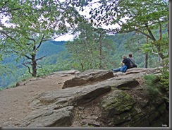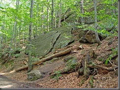 Takie otoczenie sprzyja swobodnemu przepływowi myśli. Zapomniałam nadmienić, że do zamku prowadzą dwa szlaki: czerwony – łatwiejszy i czarny – trudniejszy, ale bardziej malowniczy. Ja wybrałam czerwony, by oszczędzić siły na relację fotograficzną z tej wycieczki. Przydrożne głazy przybierały nieraz malownicze kształty. Zawsze, ilekroć widzę te podpierające je patyczki uśmiecham się, bo wyobrażam sobie, że to leśne skrzaty je tam zostawiły.