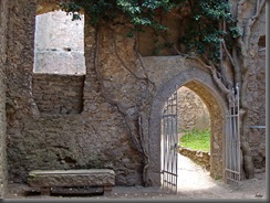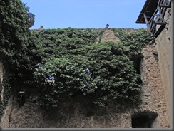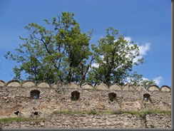 Znalazłam się na dziedzińcu gospodarczym. Otaczające go mury pochodzą z XVI i XVII w. Znalazły tu swoje miejsce: mieszkanie komendanta i stajnie. Na wprost widać bramę prowadzącą na dziedziniec główny, a po prawej pod drzewem, wykutą w skale cysternę, w której zbierano deszczówkę. Poniżej mury z wybitymi oknami strzelniczymi i ozdobną renesansową attyką.