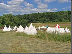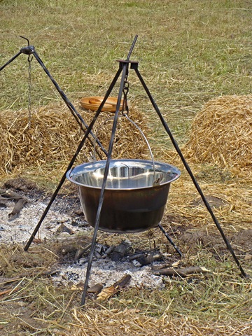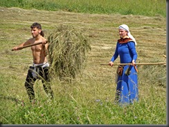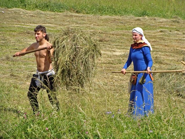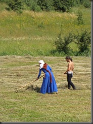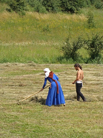 Życie w obozie zazwyczaj toczy się, jak widać, wokół codziennych spraw. Kobiety przygotowywały posiłek. Trzeba było też zgrabić skoszoną trawę, co w tym upale i w tych strojach z pewnością nie należało do przyjemności…