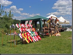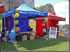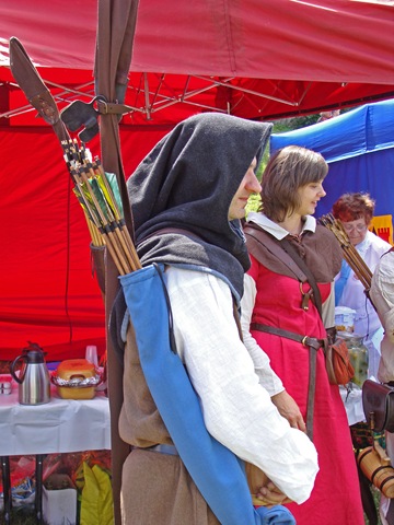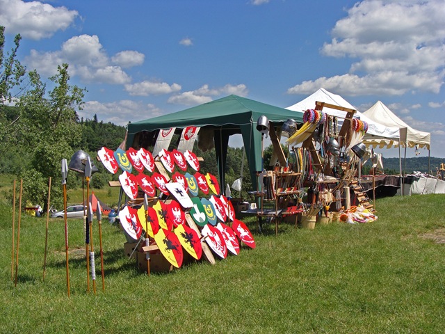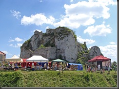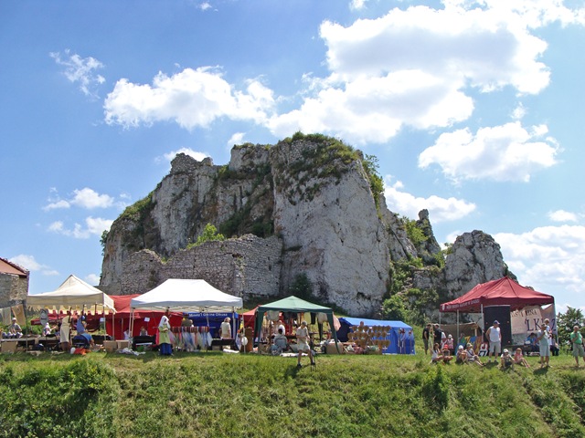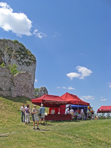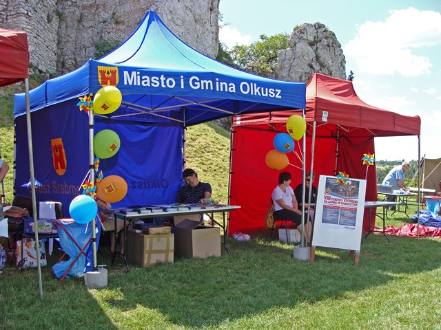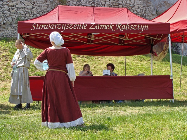 Tuż pod murami  rozstawiono liczne stoiska. Można było tam znaleźć materiały informacyjne, elementy strojów i uzbrojenia rycerskiego, a także coś dla pokrzepienia ciała.