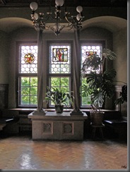 Tutaj również dostrzegamy witraże zdobiące okna.