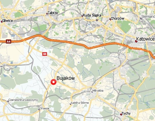 Zanim zajmę się szczegółami, napiszę kilka słów, jak trafić do Bujakowa. Jest to wioska położona w południowej części GOP, w powiecie mikołowskim, przy skrzyżowaniu dróg wojewódzkich nr 925 i 927. By łatwiej tam trafić radzę skorzystać z mapki.