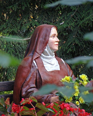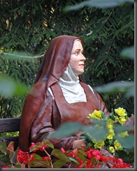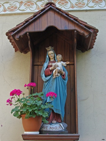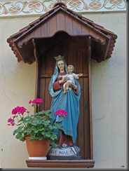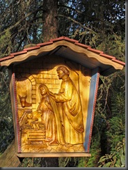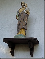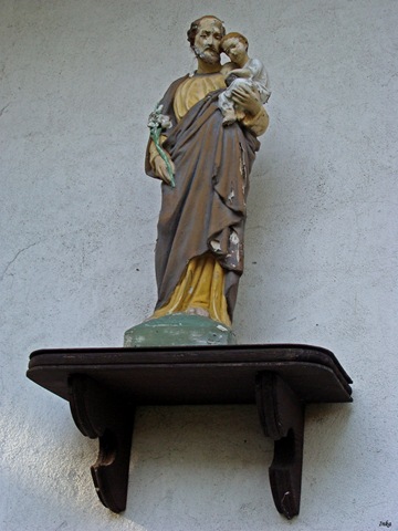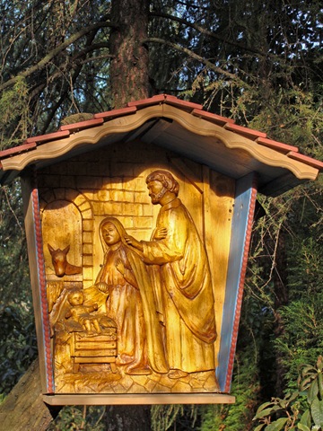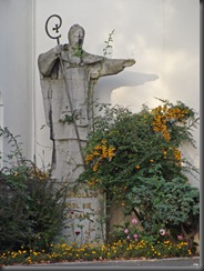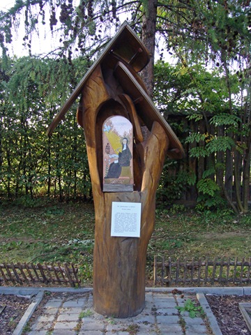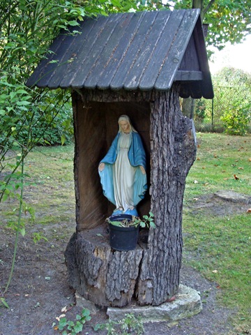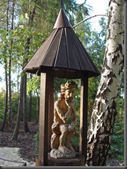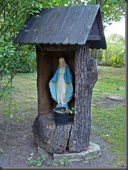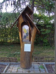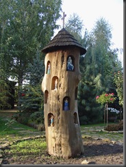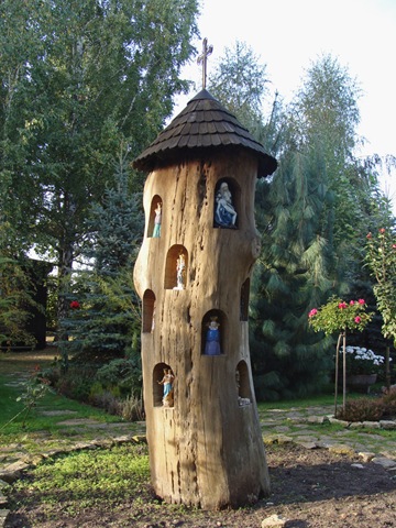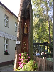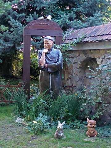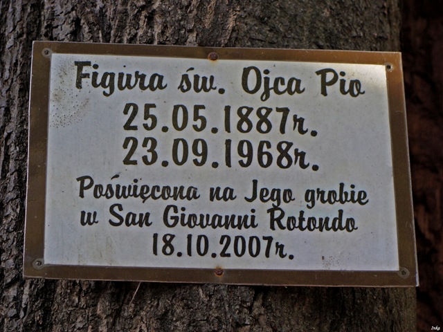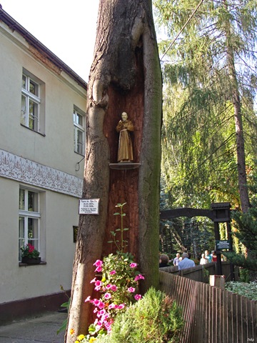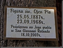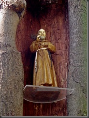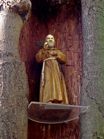 U wejścia niejako wita nas umieszczona w pniu figura św. Ojca Pio z jednej strony, a Marii z drugiej.