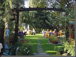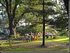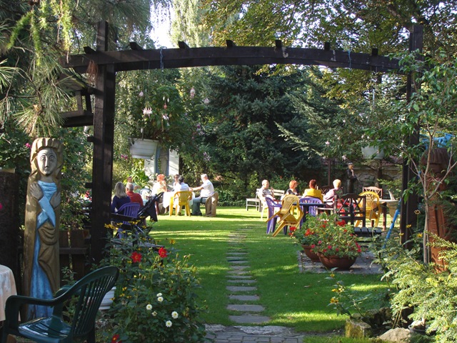 Tuż obok znajduje się miejsce przeznaczone na odpoczynek przy kawce. Stoją tu stoliki, krzesełka, a dokoła mnóstwo zieleni i kwiatów.