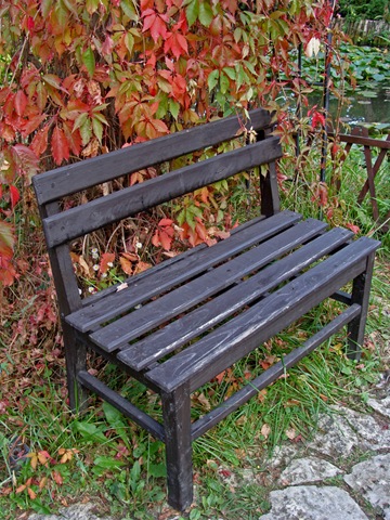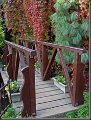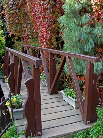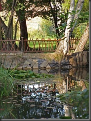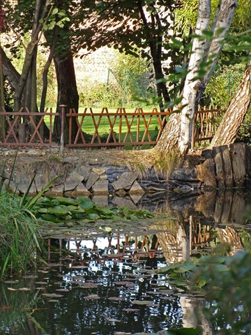 a za nim dostrzegamy staw. Nad jego brzeg prowadzi malowniczy mostek, a tuż za nim romantyczna ławeczka.